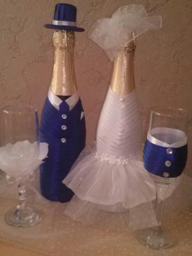 Оформление шампанского на свадьбу в виде жениха и невесты,изготовление казны, браслетов для подруги невесты и бутоньерки для жениха.